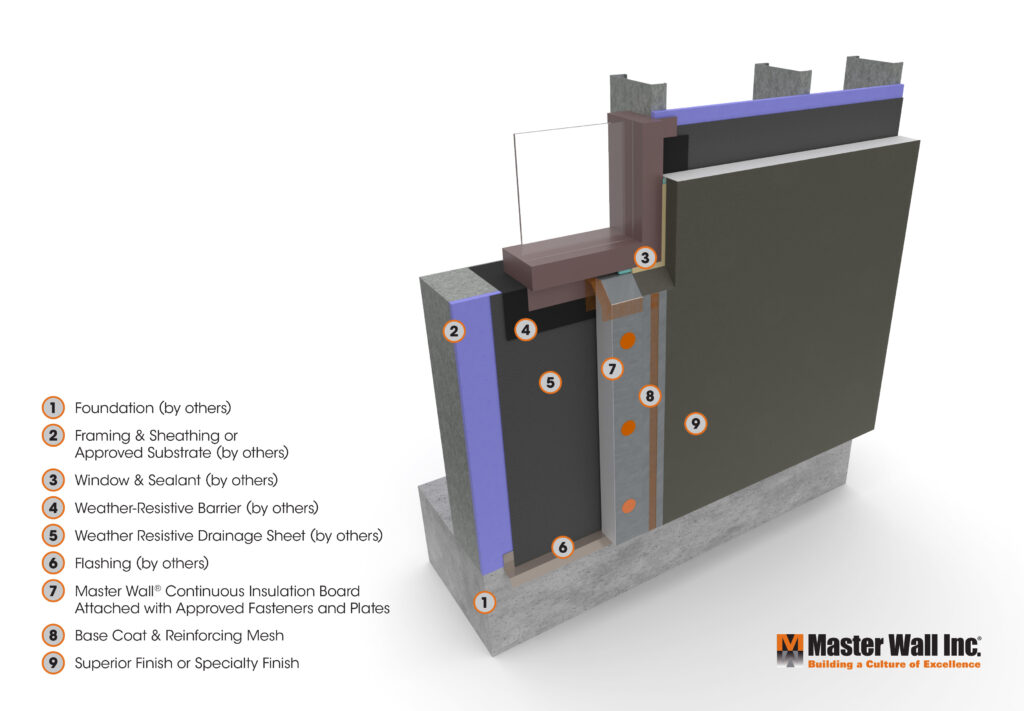 Aggre-flex Drainage is a mechanically attached Class PB (Polymer-Based) Exterior Insulation and Finish system (EIFS) applied over a code-approved water barrier and an approved substrate. This system offers several drainage cavity options, including a flat insulation board, drainage insulation board, or various drainage spacers up to and including Delta® Dry rainscreens.